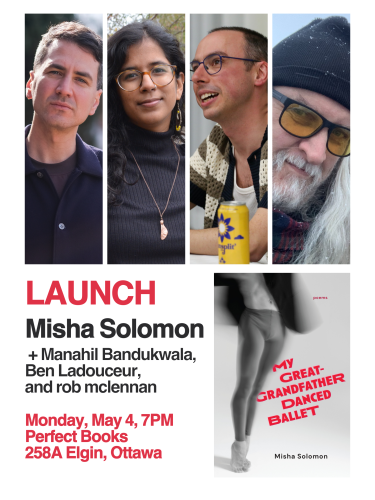 We hope you’ll join us in celebration of Misha Solomon’s wonderful debut poetry collection with Brick Books, My Great-Grandfather Danced Ballet. He will be joined by local authors Manahil Bandukwala, Ben Ladouceur, and rob mclennan.