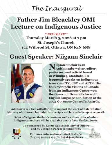 Join us at the free event on the subject of Indigenous Justice with guest speaker Niigaan Sinclair, co-sponsored by St.Joseph's Parish and Kateri Native Ministry of Ottawa.