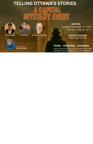 Don't miss the launch of A Capital Mystery, presented by Crime Writers of Canada, an anthology of short stories all set in Ottawa. Featuring readings and a panel with contributors Nancy Pawelek, Art Pittman, and Bernadette Hendricks, moderated by Barbara Fradkin. Audience Q&A to follow.